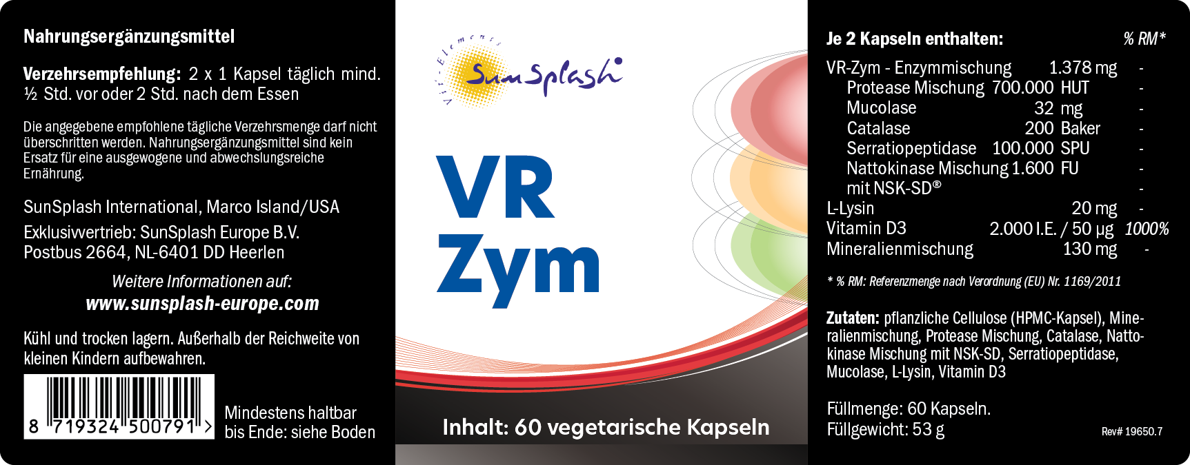 Das speziell entwickelte Nahrungsergänzungsmittel SunSplash VR-Zym bietet für die Funktion des Immunsystems Unterstützung auf eine einzigartige Weise. Es empfiehlt sich die Einnahme von 2 vegetarischen Kapseln auf nüchternen Magen, d.h. mindestens ½ Stunde vor oder 2 Stunden nach einer Mahlzeit.