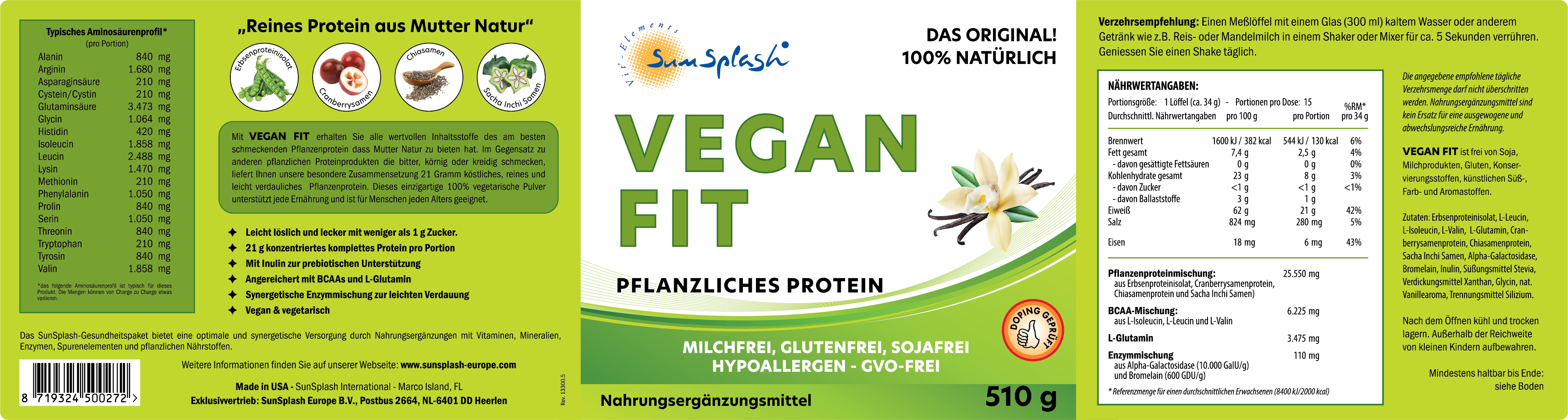 SunSplash Vegan Fit wurde speziell für eine gesunde Ernährung entwickelt. Es besteht aus einer einzigartigen Mischung aus hochwertigem Erbsenproteinisolat, Cranberry-, Chia- und Sacha Inchi Samen, die alle 18 Aminosäuren, einschließlich aller essentiellen Aminosäuren, enthält. Das Produkt ist zu 100% natürlich, vegan, sojafrei, milchfrei, glutenfrei, hypoallergen und GVO-frei.