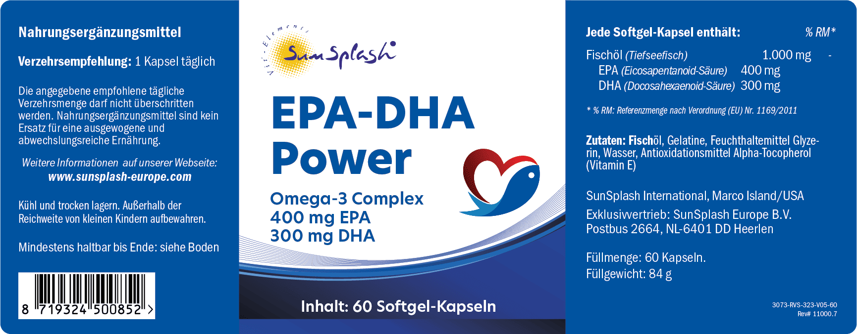 Entdecken Sie jetzt einen unserer Bestseller für Ihre Gesundheit! SunSplash EPA-DHA Power ist unser hochdosiertes Meereslipidkonzentrat aus Tiefseefisch. Mit Softgel-Kapseln von je 1.000 mg und einem hohen Anteil von 400 mg EPA und 300 mg DHA pro Kapsel ist SunSplash EPA-DHA Power eine ideale Ergänzung für eine gesunde Ernährung.