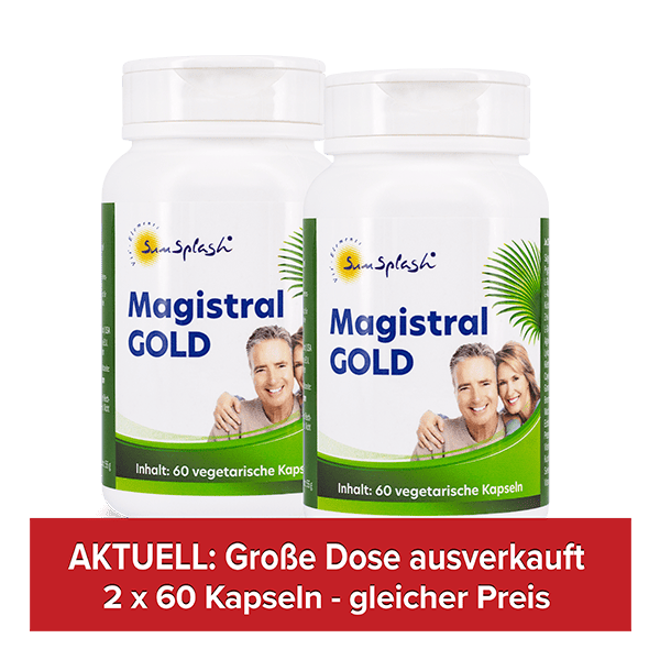 Investieren Sie in Ihre Vitalität mit SunSplash Magistral Gold XL, erhältlich im praktischen 1-Monatspack oder 2-Monatspack mit 60 bzw. 120 vegetarischen Kapseln.